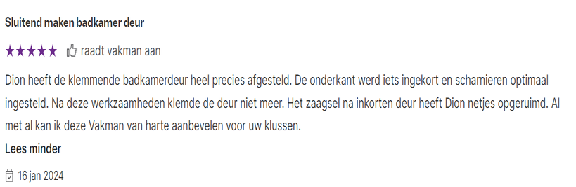 Er zijn een aantal reviews achtergelaten over werkzaamheden die ik heb uitgevoerd bij klanten aan de wastafel, douche, voordeur, kitwerkzaamheden en nog veel meer. Lees hieronder wat andere klanten over mij zeggen.